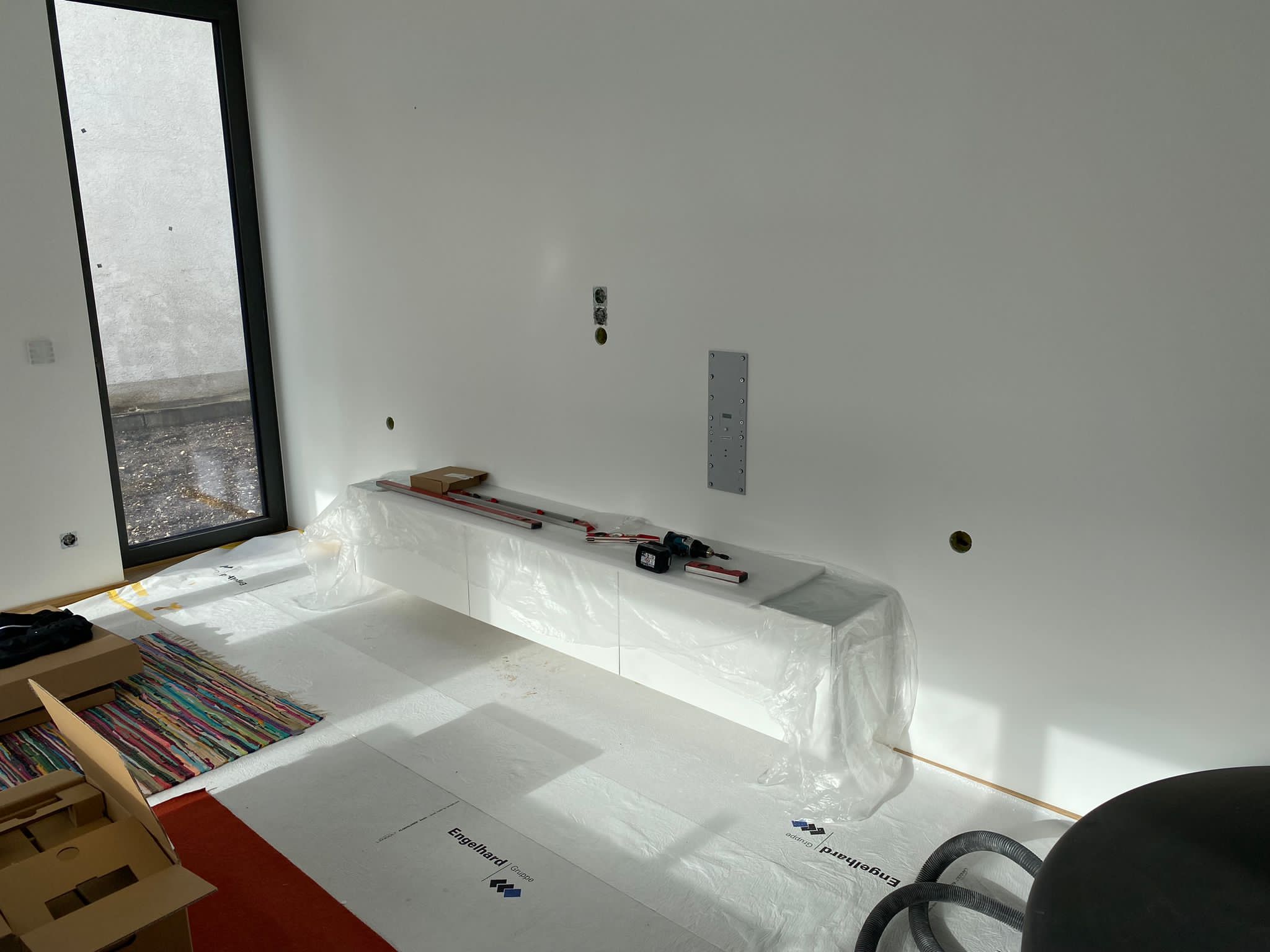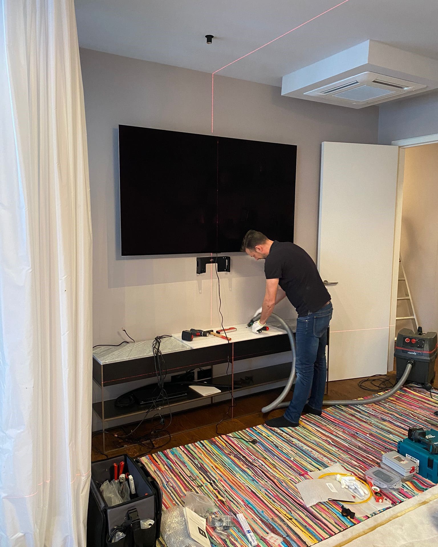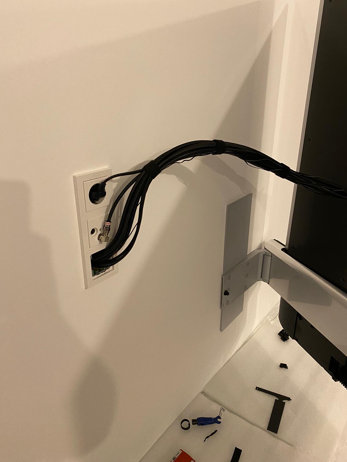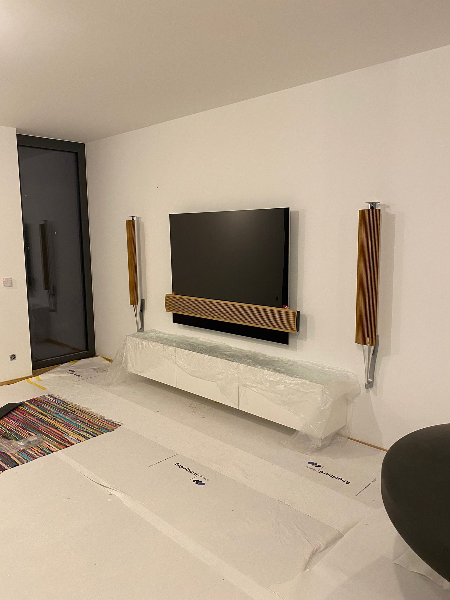 Der BeoVision Theatre ist mit seinen 83" und knapp 80 Kg ein echtes Kampfgewicht. Der Fernseher stand die ganze Zeit auf dem Sideboard und sollte nun aufgehängt werden, so dass das Sideboard wieder komplett genutzt werden kann. Für unsere erfahrenen Techniker, war dieses Projekt natürlich kein Problem.