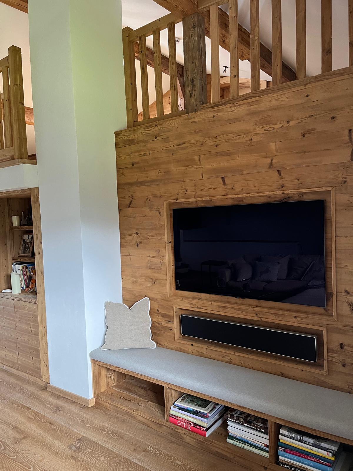 Jedes Detail wurde hier genauestens durchdacht. Mit der exakten Ausfräsung für den Fernseher und die Bang & Olufsen Stage, wurde ein idealer Platz geschaffen, in dem Rustikalität und Modernität perfekt zusammenspielen. Zugleich zerstört der Fernseher durch seinen optimal gewählten Platz nichts von dem außergewöhnlichen Flair dieses Hauses. Somit kann man sehen, dass sich unsere Fernseher natlos in jeden Einrichtungsstil einfügen.