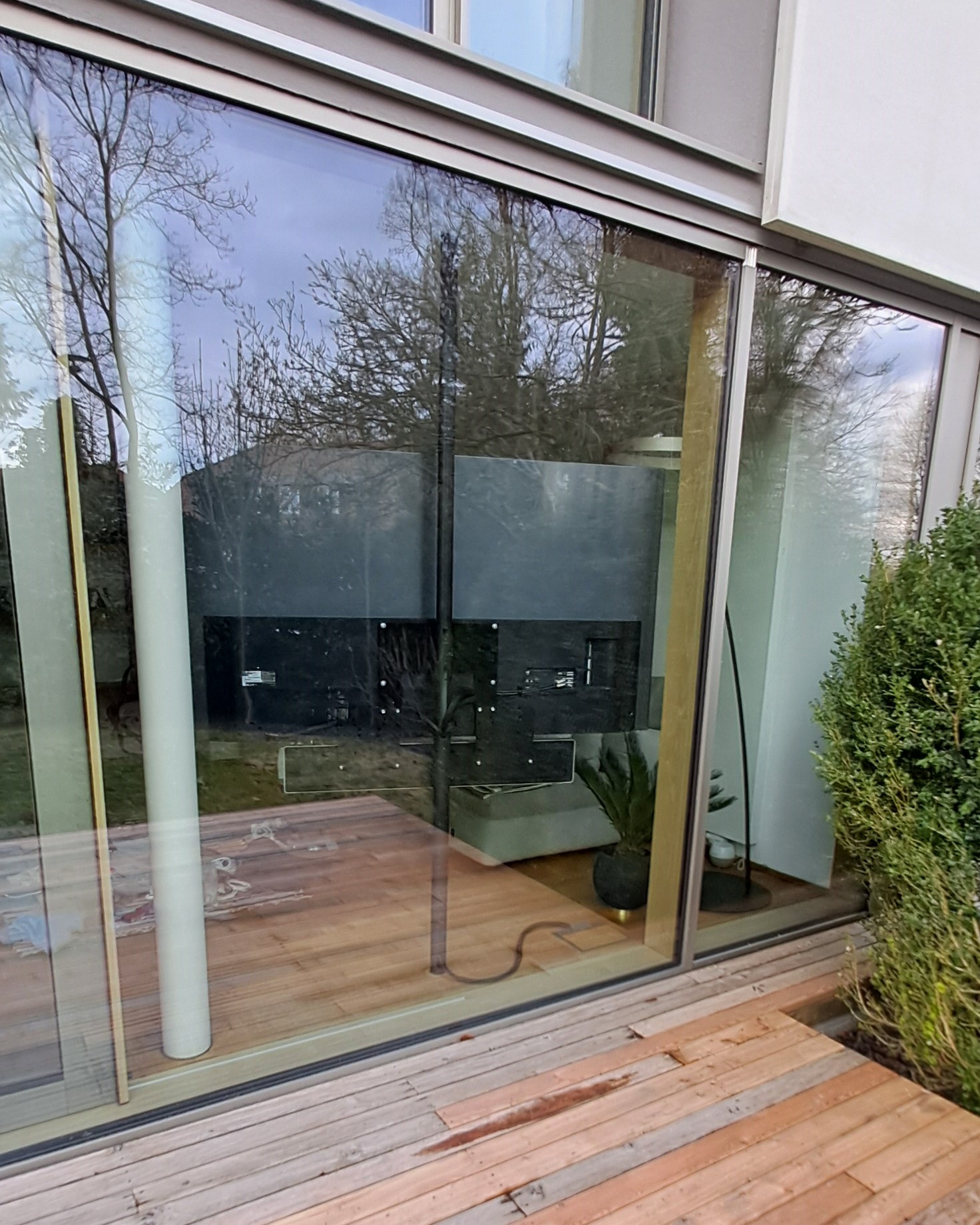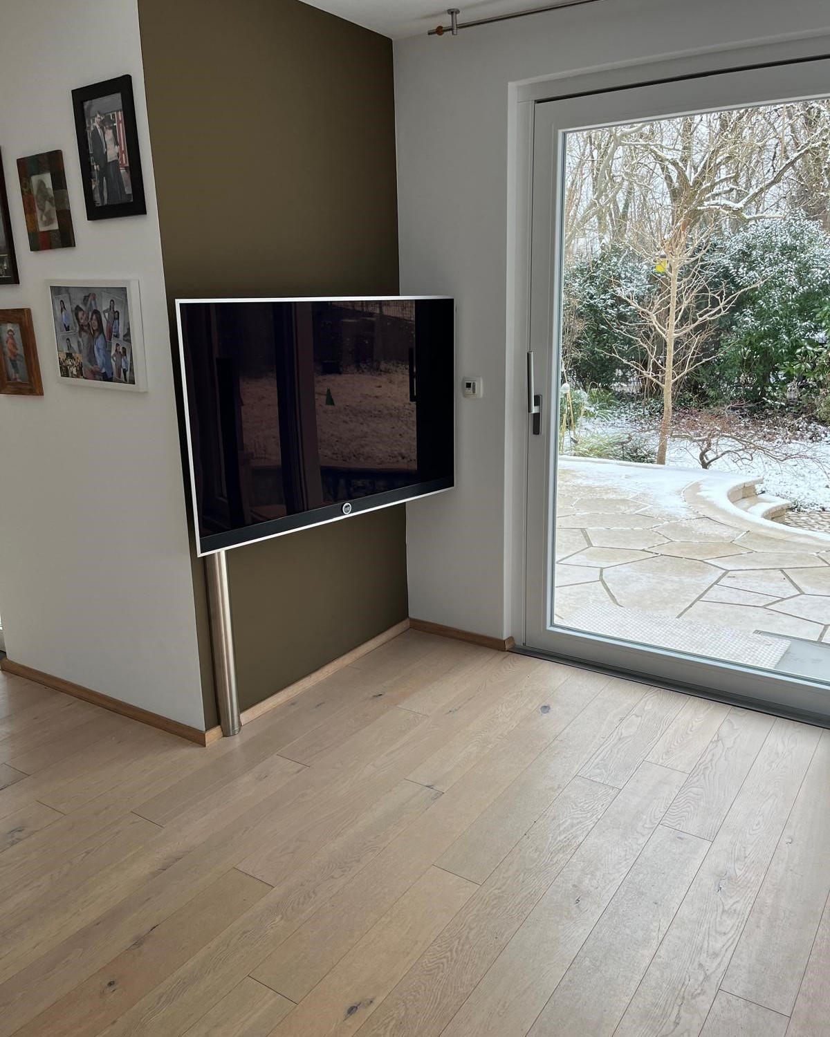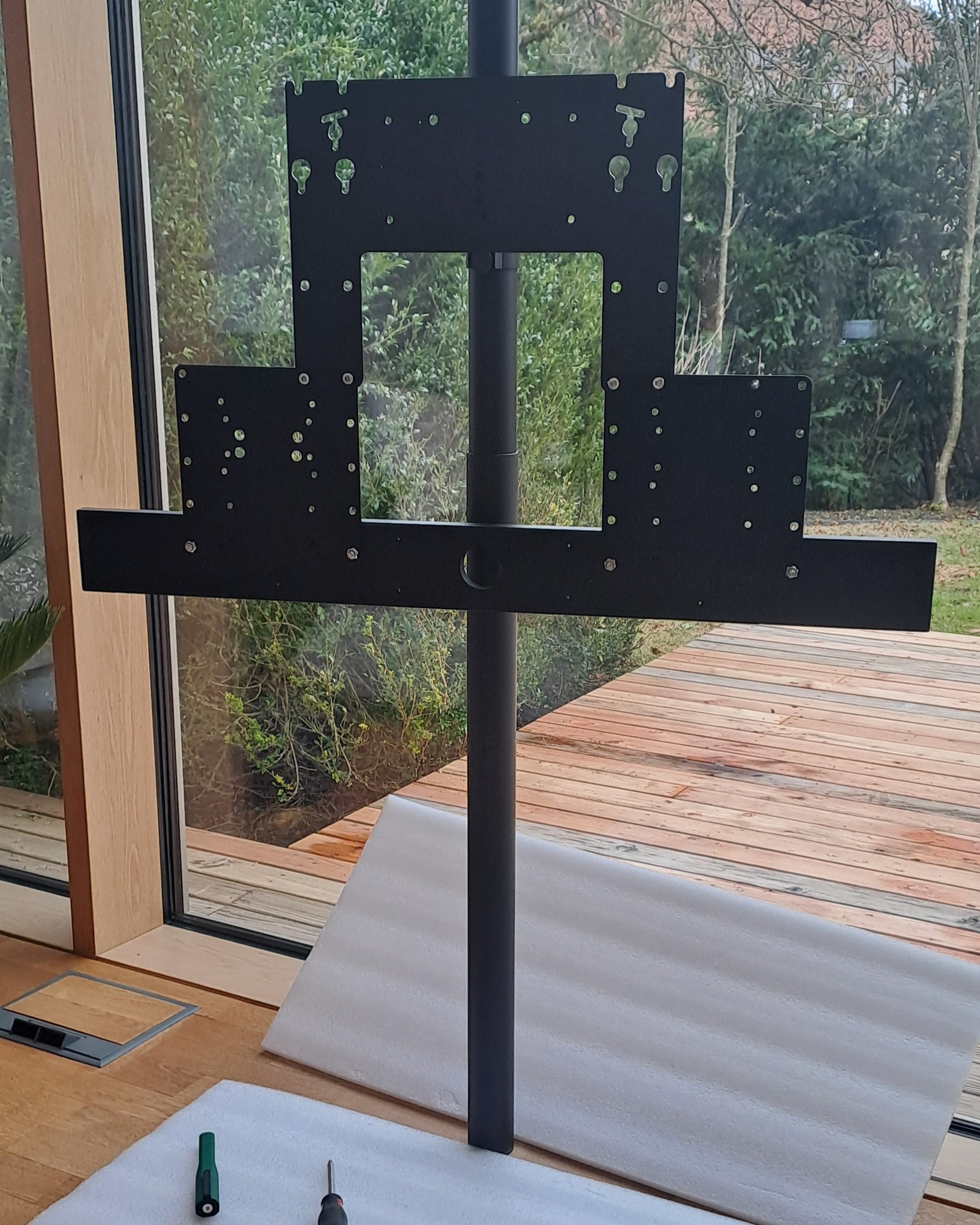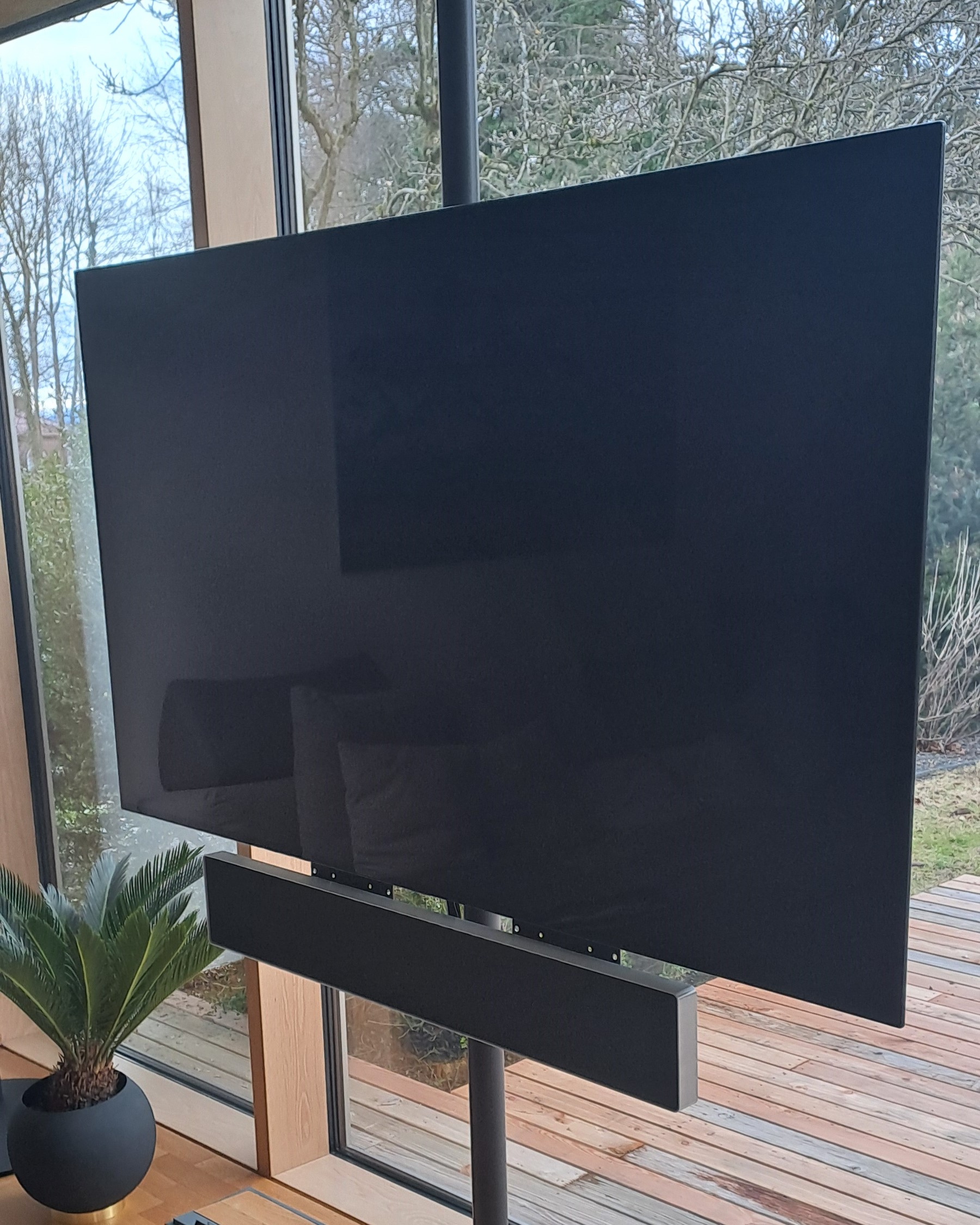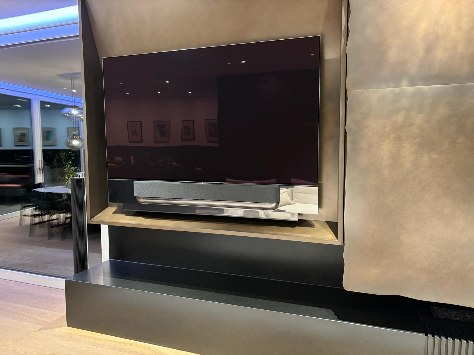Für diese individuelle Aufhängung musste viel verändert werden. Der Boden wurde an der präzisen Stelle angepasst, um das Loch zum Einlassen des Floor2Ceiling-Teleskopstabs exakt zu positionieren, sodass dieser perfekt steht. Aufgrund der hochwertigen Komponenten - einer Fernsehhalterung von Loewe, einem Fernseher von LG und einer Soundbar von Bang & Olufsen - war es erforderlich, nahezu alle Teile selbst anzufertigen. Durch diese exquisite Spezialanfertigung hat der Kunde die außergewöhnliche Möglichkeit, den Fernseher um 360 Grad zu drehen. Dies erlaubt ihm, das Fenster zu öffnen, den Fernseher zum Garten auszurichten und dort in entspannter Atmosphäre fernzusehen. So wird der Garten in ein erweitertes Wohnzimmer verwandelt, das ein unvergleichliches Fernseherlebnis unter freiem Himmel bietet.