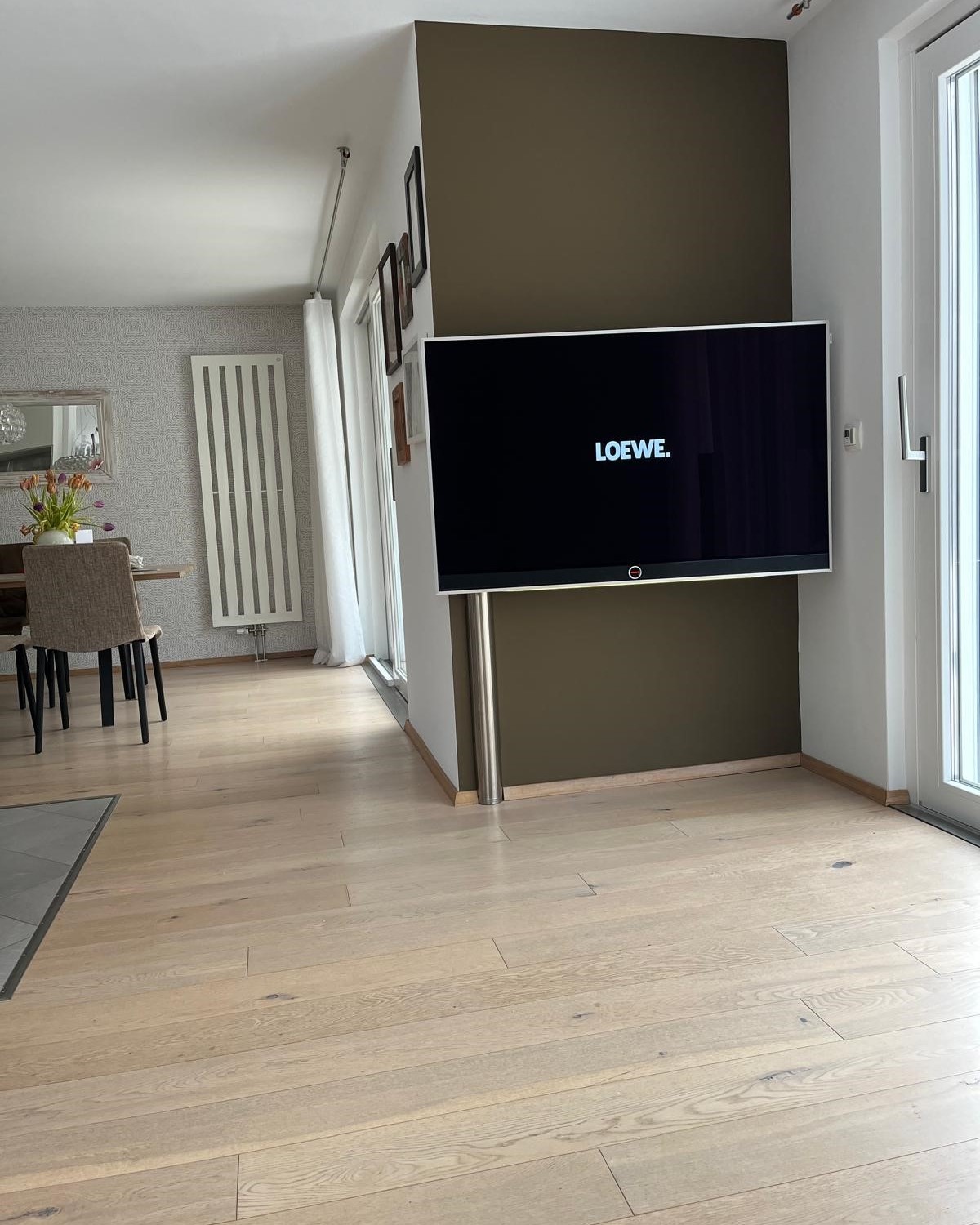 Hier wurde ein Loewe Stellar mal anders Montiert. Mit der besonderen Fernsehwandhalterung von Wissmann, hat der Kunde die Möglichkeit den Fernseher um theoretisch 360 Grad zu drehen. Dieser Prozess wird natürlich durch die Wand verhindert, ein großer Spielraum wird allesdings trotzdem ermöglicht.