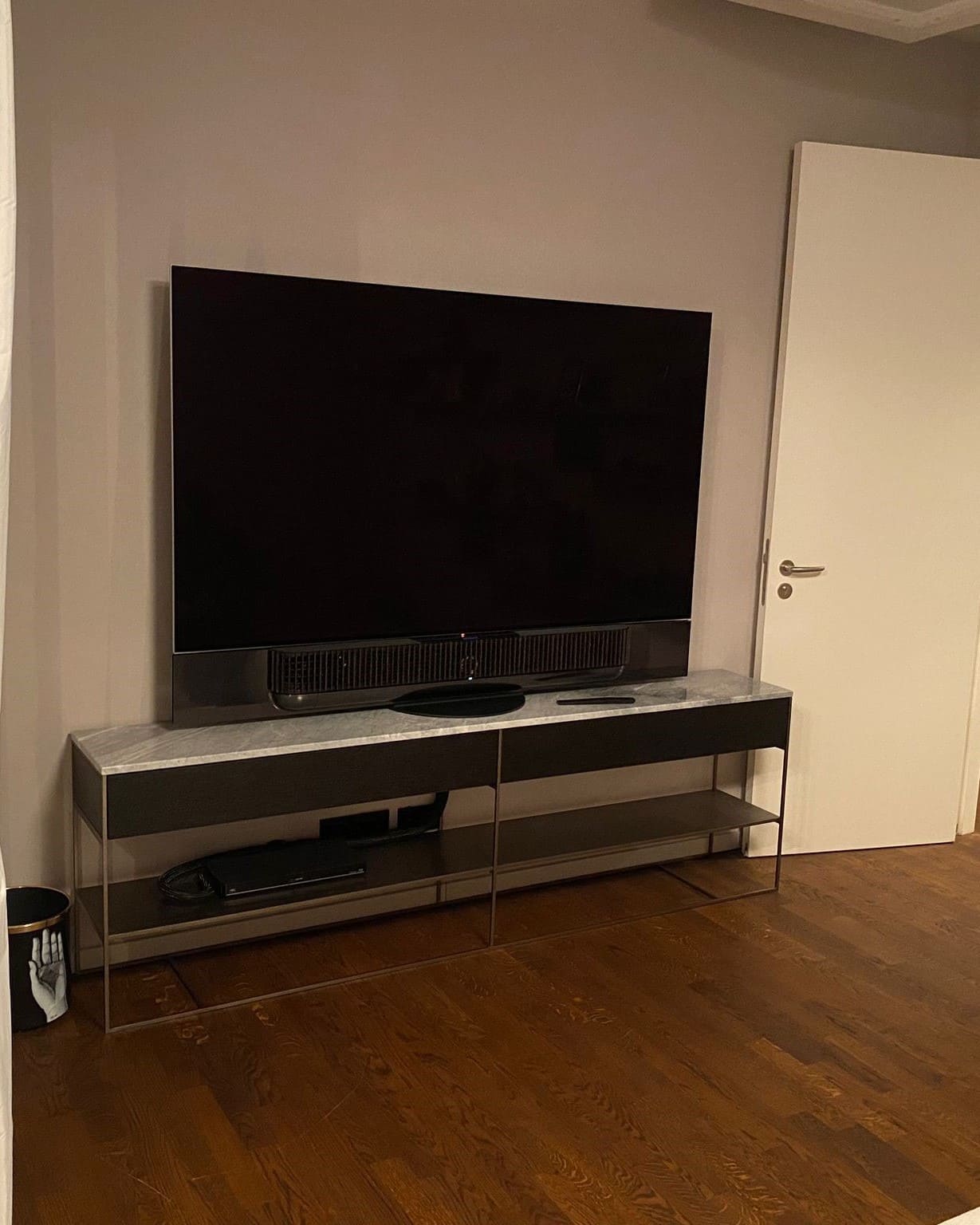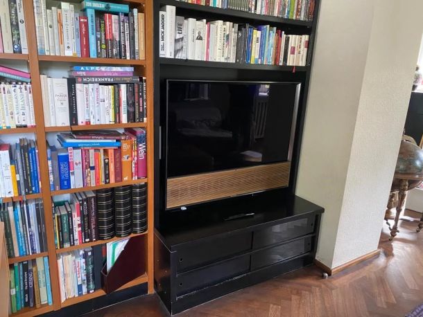 Diese BeoVision Theatre, wurde auf endle weise Farblich mit dem Möbelstück unter Ihm abgestimmt. Durch dieses geschickte Design, fügt sich der Fernseher natlos in die Wohnung ein. Mit einer Wandhalterung und verschiedenen Abdeckung wurden die Kabelversteckt und der Fernseher aufgehengt.