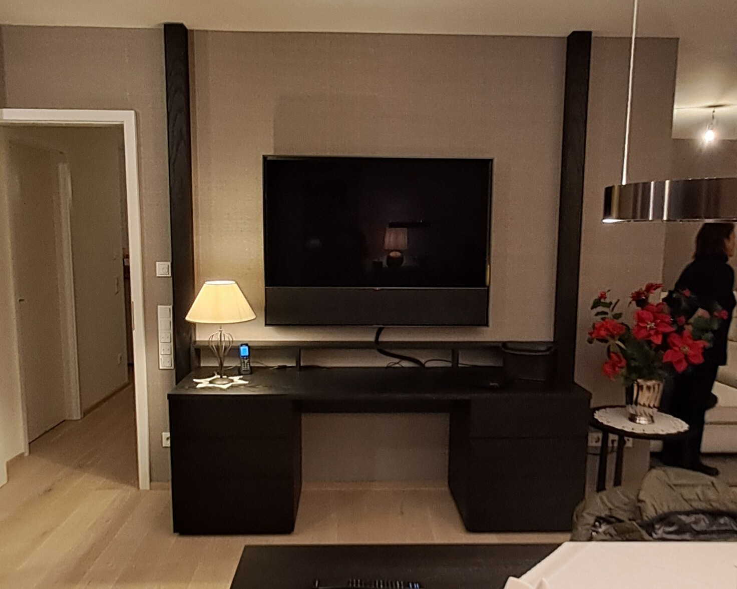 Bei diesem Projekt wurde der Loewe Bild V.65 mit einer Bang & Olufsen Theatre Soundbar kombiniert. Die Soundbar arbeitet mit dem Fernseher via Audiorückkanal, die eigene Wunschplaylist ist unabhängig abspielbar. Es wurde zugleich ein komplett neues Medienzentrum errichtet, dieses befindet sich in der Kommode unter dem Fernseher.