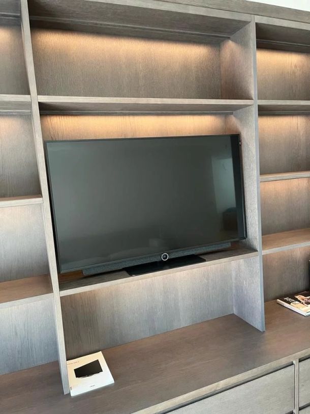 Die warmen, braunen Holzelemente in Verbindung mit dem Fernseher bringen Natürlichkeit mit moderner Technik zusammen, wodurch eine einladende und zeitlose Atmosphäre entsteht. Diese durchdachte Einrichtungslösung verwandelt Ihr Wohnzimmer in einen Ort, an dem Design und Funktionalität Hand in Hand gehen, und bietet Ihnen ein unvergleichliches audiovisuelles Erlebnis in einem stilvollen Ambiente.