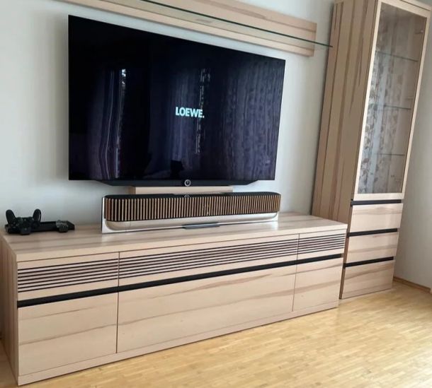 Der erste ausgelieferte Loewe Stella stylisch integriert. Mit seinem grauen TV-Stand passt er sich farblich optimal an. Mit seinen vielen features wie Loewe os, Apple AirPlay und DTS Play-Fi ist er der perfekte Allrounder. Durch seine OLED Panels und dem Dolby Vision, bietet er ein perfektes TV-Erlebnis. Mit seinen vielseitigen Streaming angeboten wie Netflix, YouTube, Amazon prime video, Disney+, Apple tv+, Rakuten, Deezer, Paramount+, HD+, Zattoo, FIFA+ und mehr wird einem nie langweilig.