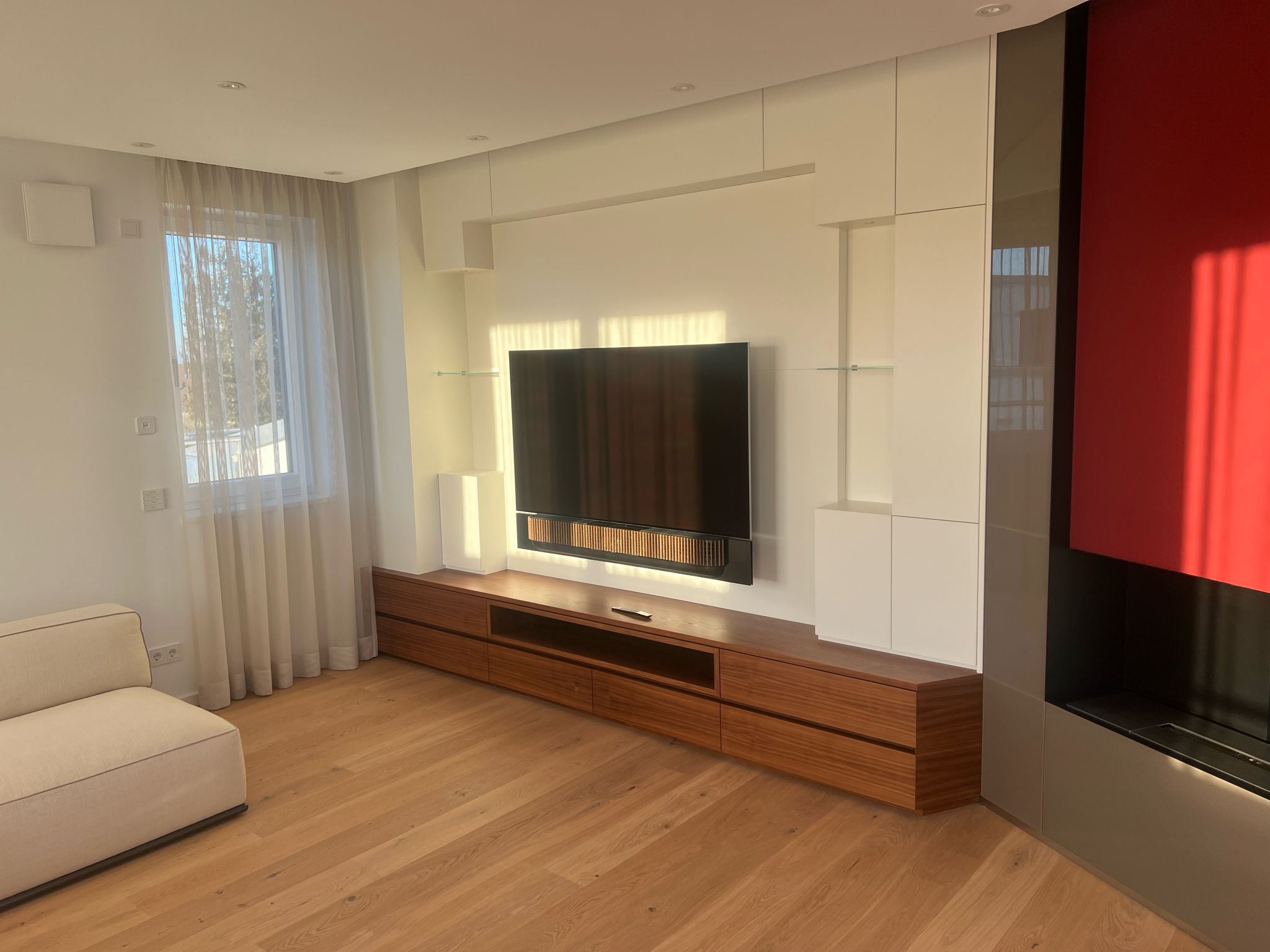 Bei diesem Projekt wurde der Loewe Bild V.65 mit einer Bang & Olufsen Theatre Soundbar kombiniert. Die Soundbar arbeitet mit dem Fernseher via Audiorückkanal, die eigene Wunschplaylist ist unabhängig abspielbar. Es wurde zugleich ein komplett neues Medienzentrum errichtet, dieses befindet sich in der Kommode unter dem Fernseher.