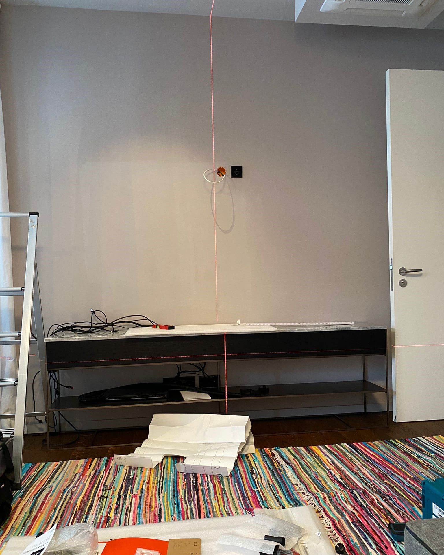 Der BeoVision Theatre ist mit seinen 83" und knapp 80 Kg ein echtes Kampfgewicht. Der Fernseher stand die ganze Zeit auf dem Sideboard und sollte nun aufgehängt werden, so dass das Sideboard wieder komplett genutzt werden kann. Für unsere erfahrenen Techniker, war dieses Projekt natürlich kein Problem.