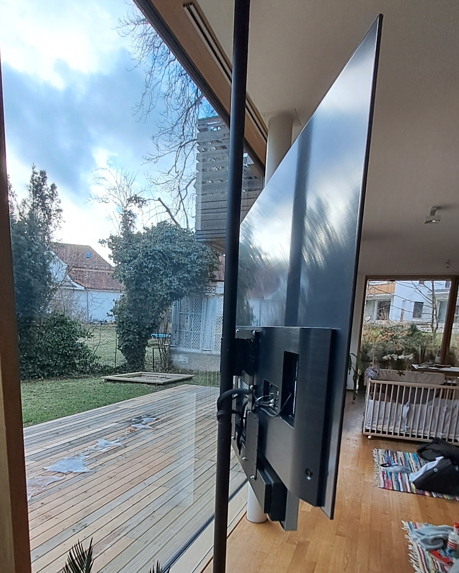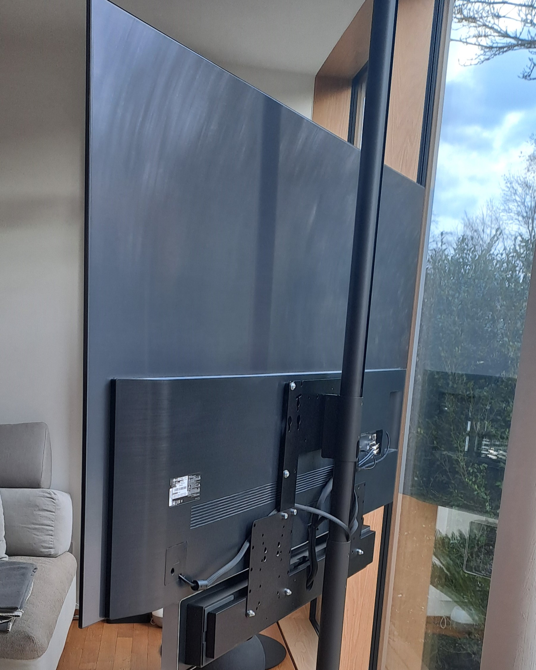 Für diese individuelle Aufhängung musste viel verändert werden. Der Boden wurde an der präzisen Stelle angepasst, um das Loch zum Einlassen des Floor2Ceiling-Teleskopstabs exakt zu positionieren, sodass dieser perfekt steht. Aufgrund der hochwertigen Komponenten - einer Fernsehhalterung von Loewe, einem Fernseher von LG und einer Soundbar von Bang & Olufsen - war es erforderlich, nahezu alle Teile selbst anzufertigen. Durch diese exquisite Spezialanfertigung hat der Kunde die außergewöhnliche Möglichkeit, den Fernseher um 360 Grad zu drehen. Dies erlaubt ihm, das Fenster zu öffnen, den Fernseher zum Garten auszurichten und dort in entspannter Atmosphäre fernzusehen. So wird der Garten in ein erweitertes Wohnzimmer verwandelt, das ein unvergleichliches Fernseherlebnis unter freiem Himmel bietet.